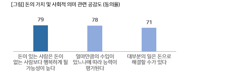 -전체 응답자의 79%가 ‘돈이 있는 사람이 그렇지 않은 사람보다 더 행복해질 가능성이 높다’고 답해, 돈의 가치에 대한 인식이 매우 강하게 나타났습니다. 또한 ‘수입이 곧 능력의 평가 기준이다’(78%), ‘대부분의 일은 돈으로 해결할 수 있다’(71%)라는 응답도 많아, 돈이 단순히 생활의 수단을 넘어 개인의 사회적 역량과 성공을 판단하는 기준으로 자리잡고 있음을 알 수 있습니다.