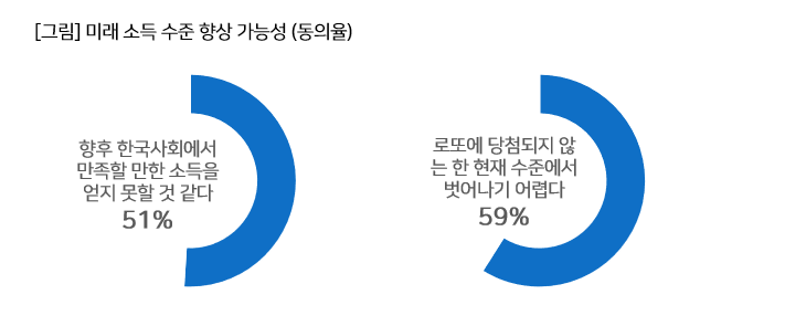 -미래 소득 수준에 대한 전망 역시 부정적이었습니다. ‘향후 한국사회에서 만족할 만한 소득을 얻지 못할 것 같다’는 응답이 51%, ‘로또에 당첨되지 않는 한 현재 수준에서 벗어나기 어렵다’는 응답이 59%로, 국민 절반 이상이 미래에도 소득 수준이 크게 나아지지 않을 것이라고 보고 있습니다.